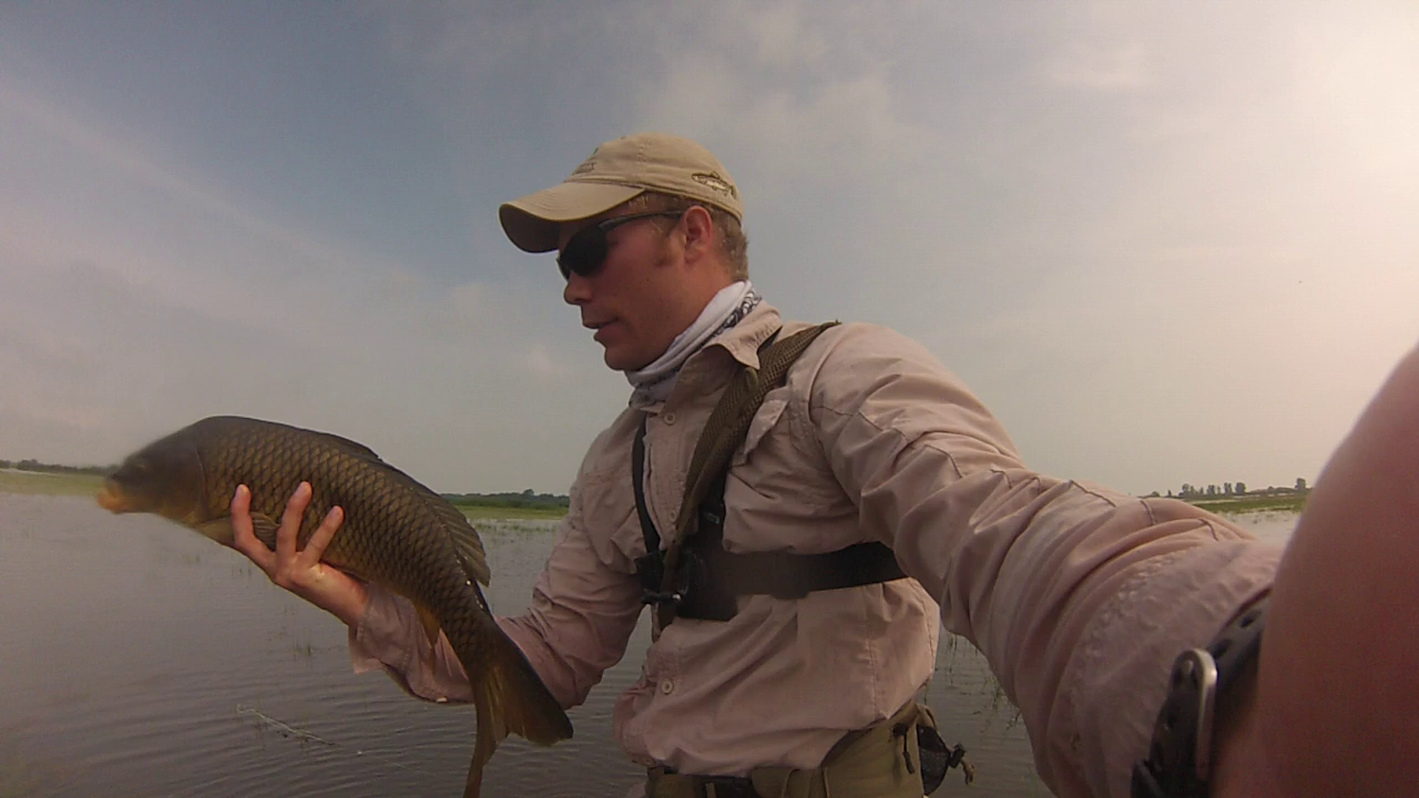 I headed out with little food in my stomach and very little sleep but I guess I'm used to both, which is a bad thing....Really have to change that bad habit even though I know better. For the first hour and a half almost two hours, I saw carp but hooked nothing but weeds. Now, I'll say this that Metzger's Marsh is a very unique fishery as there is, at least right now, a lot of aquatic plant growth everywhere which makes it a perfect habitat for carp to feed and sleep. I was literally stepping on, creeping up to, and dropping the fly upon the carp. It breaks every law of the 10 Commandments of Carping but that's what makes it amazing and unique. Your heart literally goes a million miles an hour because you're literally 3 feet away from a 10lb carp and you drop the fly on its nose, watch it go for the fly and set the hook. Fight is on!